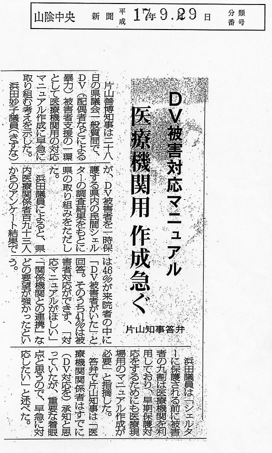 浜田妙子がDV被害者の早期保護対応のため医療現場用マニュアル作成の必要性を指摘