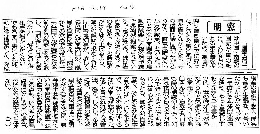 県議会で浜田妙子が、人権救済手続き条例をもっと時間をかけて練り上げるよう質問